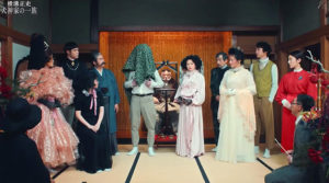 それに比べると、今回の「30分で分かる犬神家」は自由ですねぇ。たとえば佐清のマスク。普通なら上の写真の唐草の風呂敷を取ると、中身はいつもの白マスク… となるところですが、【コレ】ですからね(←ネタバレされたくない方はクリックしないようお願いいたします)。確かにこちらのほうが原作に近いのですが(笑)。さらっと洋装の松竹梅三姉妹をやっているのもポイント高い。小劇団の公演のような、シュールで、なおかつお笑いの要素をふんだんに取り入れた演出で、それ自体は珍しいものではないという意見もあるでしょう。実際、この「横溝正史短編集」に先立って、同じスタッフで製作され、女優(満島ひかり)が明智小五郎を演じることで話題になった「江戸川乱歩短編集」もまた、同じアプローチの演出でした。